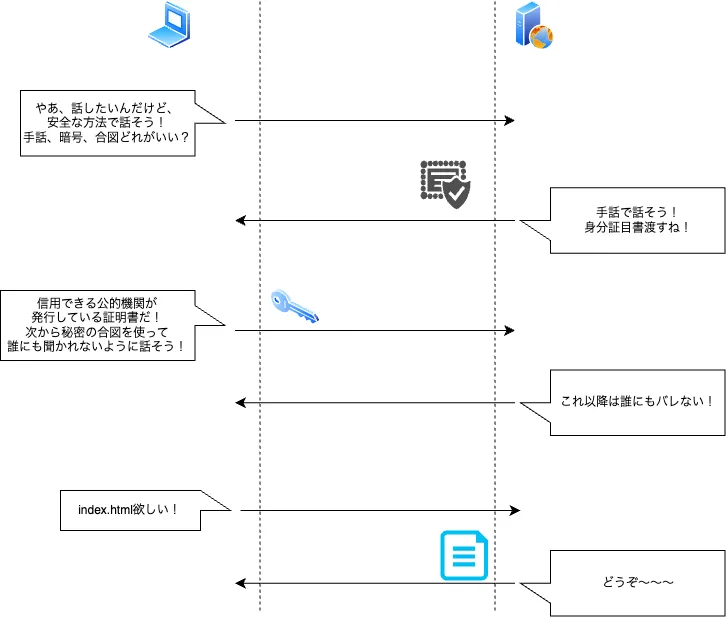 ハンドシェイクを通して、クライアント(CL)とサーバー(SV)両者は暗号方式の合意、証明書の検証、鍵の共有を行い、その後の通信を暗号化する。